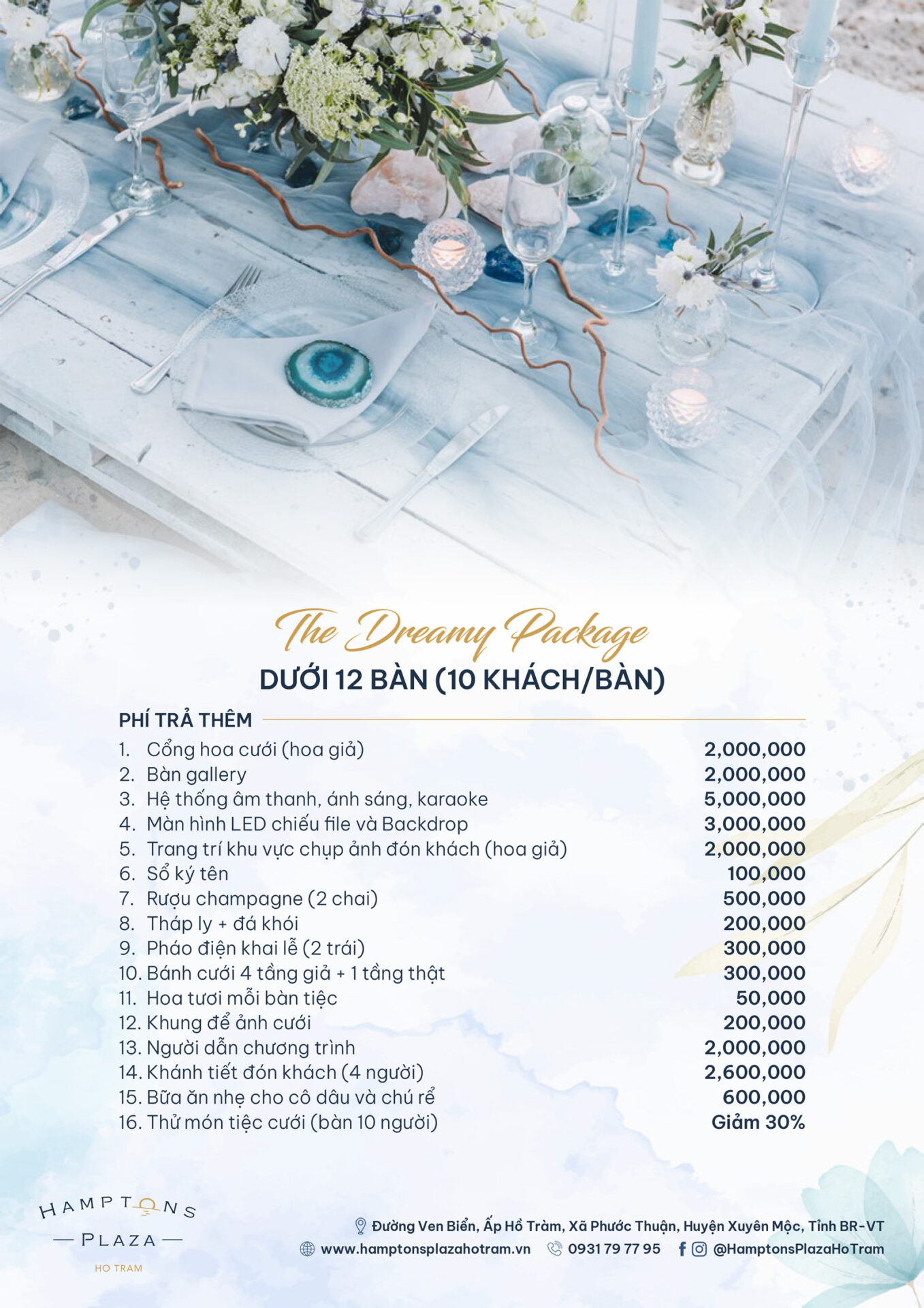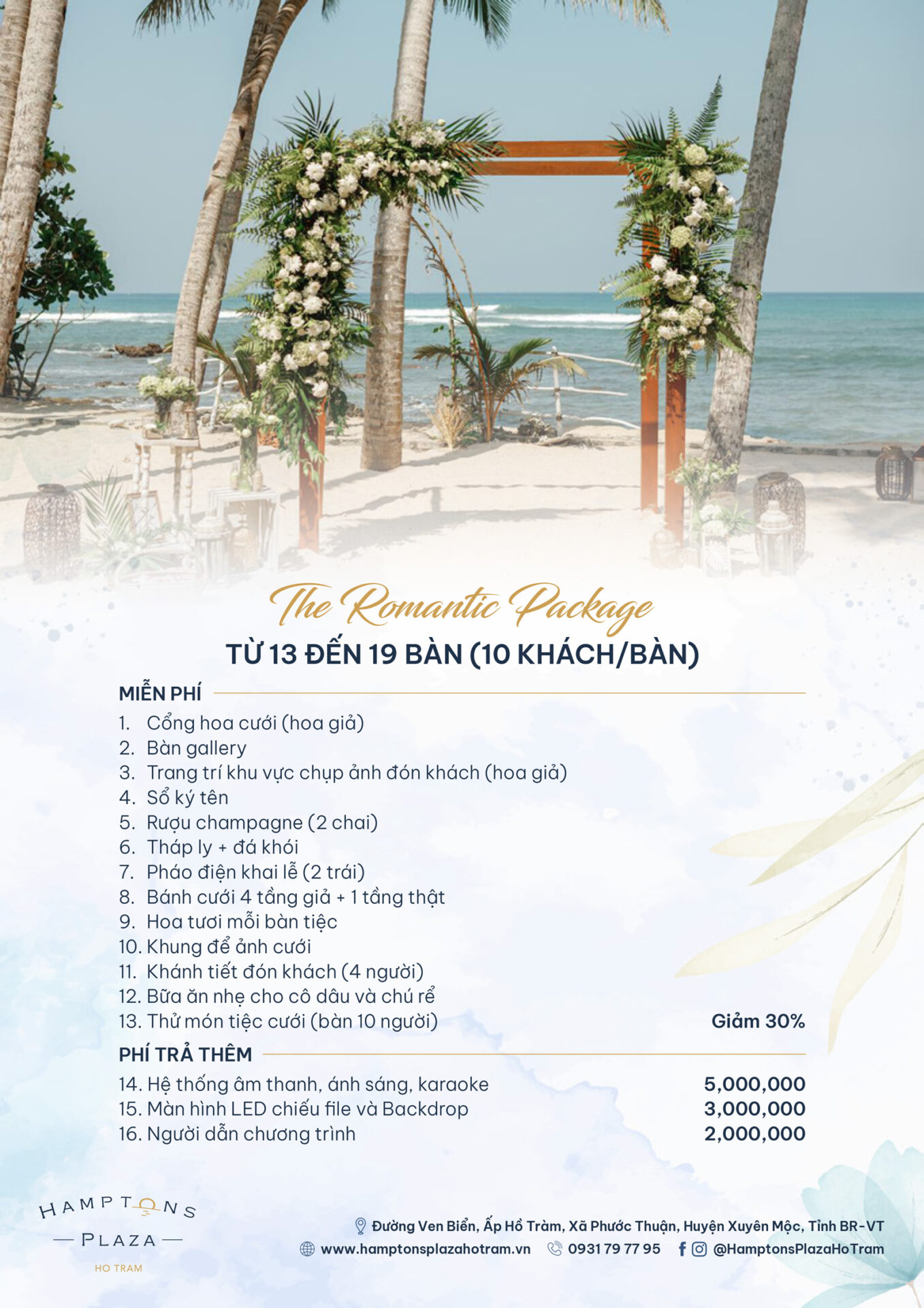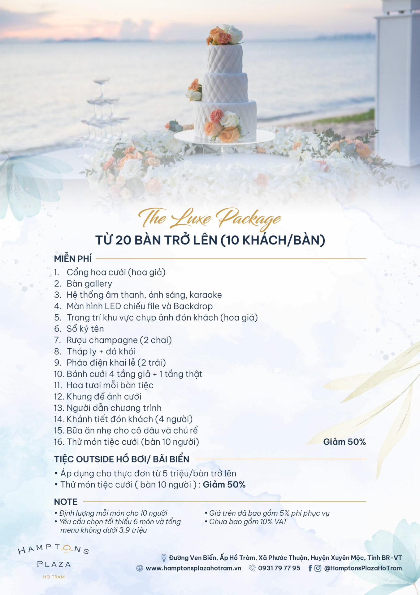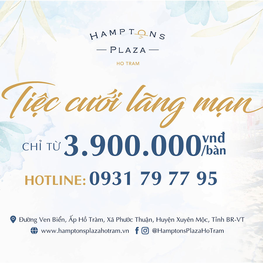 Ghi dấu ấn của ngày lễ ước hẹn thành đôi với phong cách riêng đầy cảm xúc, sang trọng mà ấm cúng tại Hamptons Plaza Hồ Tràm. Hãy để chúng tôi có vinh dự được góp phần nhỏ bé tổ chức ngày trọng đại của bạn với dịch vụ chuyên nghiệp, đẳng cấp, không gian tiện nghi, sang trọng mà độc đáo tại Cầu ngắm biển Hamptons Pier, bên bờ biển thơ mộng hay hồ bơi lung linh hoặc bất cứ nơi đâu bạn muốn…